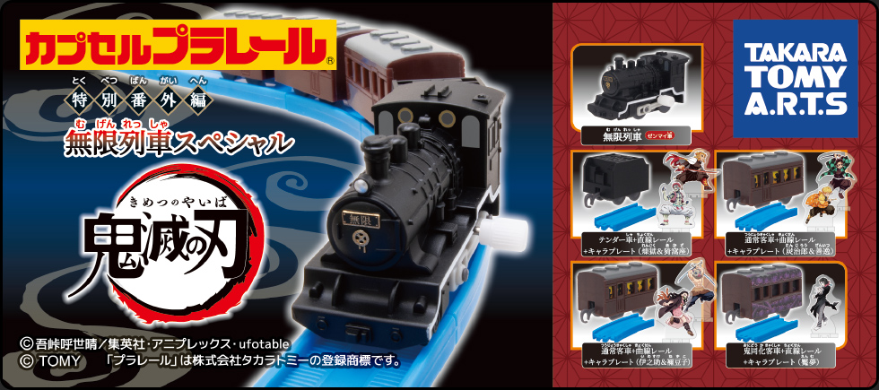 カプセルプラレールにアニメ『鬼滅の刃』に登場する無限列車が登場。 ゼンマイ車以外のカプセルに付属する炭治郎ら鬼殺隊や 魘夢ら鬼のキャラプレートは 各車両の屋根に取り付けて劇中のシーンを再現して遊ぶことができます。 サイズは約45cm~。TVアニメ「鬼滅の刃」 無限列車編公式サイト ポータルトップ 鎹鴉通信 鬼滅の刃とは 原作 アニメ 展覧会 オーケストラ ゲーム